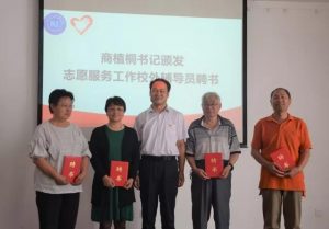 商植桐书记向天津市志愿服务联合会劳动模范分会、海河之滨支边助学携手小分队到场嘉宾颁发志愿服务工作校外辅导员聘书,希望老前辈的光和热深切影响、感化我们的新一代老员工。