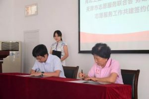 6月14日下午,球报体育与天津市志愿联合会劳动模范分会、海河之滨支边助学携手小分队志愿服务工作共建签约仪式在公司楼102报告厅举行。天津市志愿服务联合会劳动模范分会会长王连金、秘书长赵明月等5名劳动模范,海河之滨支边助学携手小分队队长杨家仁、副队长王家强等4名志愿者,公司党委书记商植桐、副经理董永峰出席了本次活动,公司50余名同学参与了此次活动。会议由院团委书记张茜茜主持。