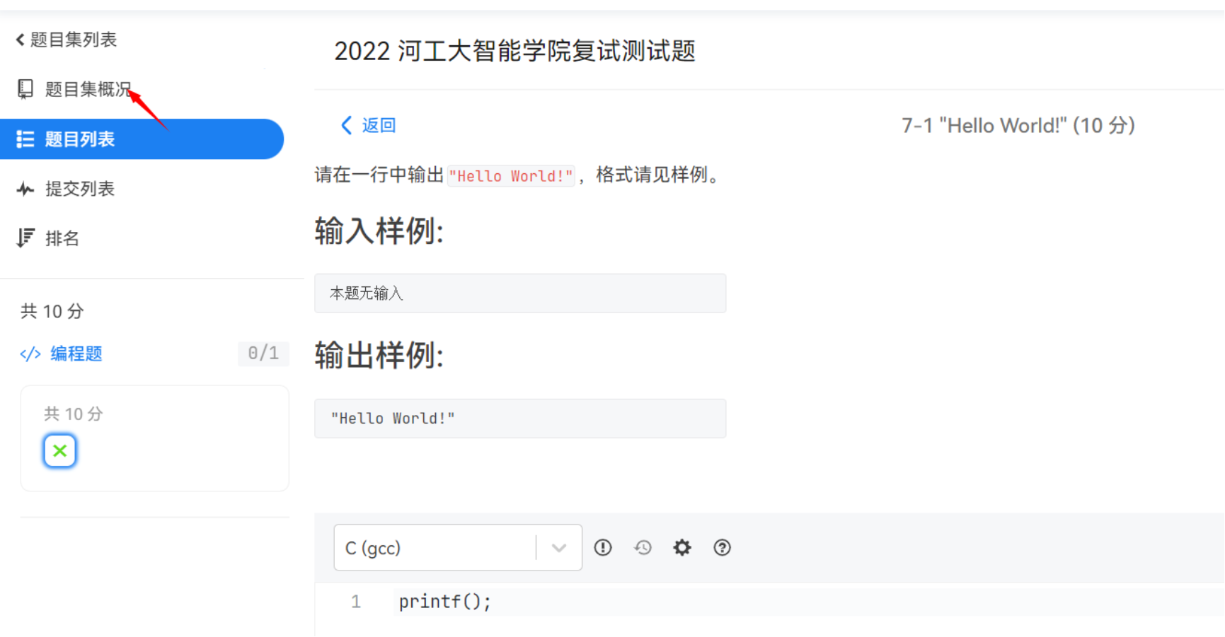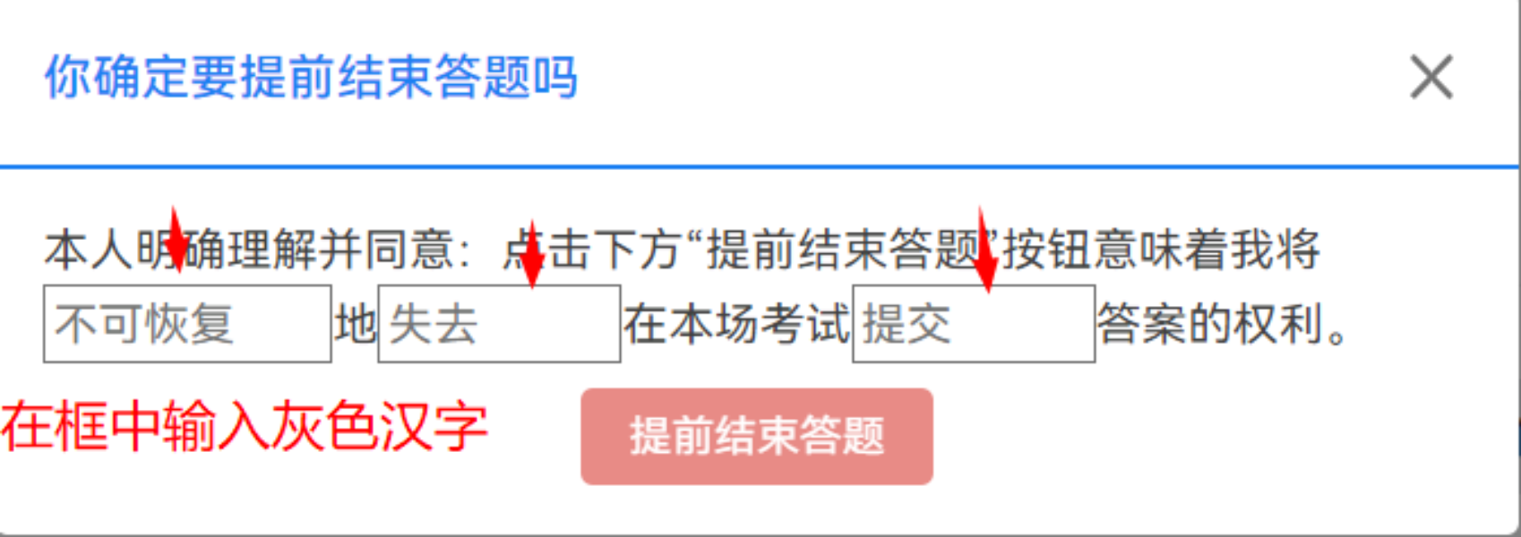 考试时间为60分钟,系统会自动倒计时,如若想提前交卷,请点击左侧 “题目集概况”,提前结束答题,并在对话框内输入灰色文字 “不可恢复” “失去” “提交”