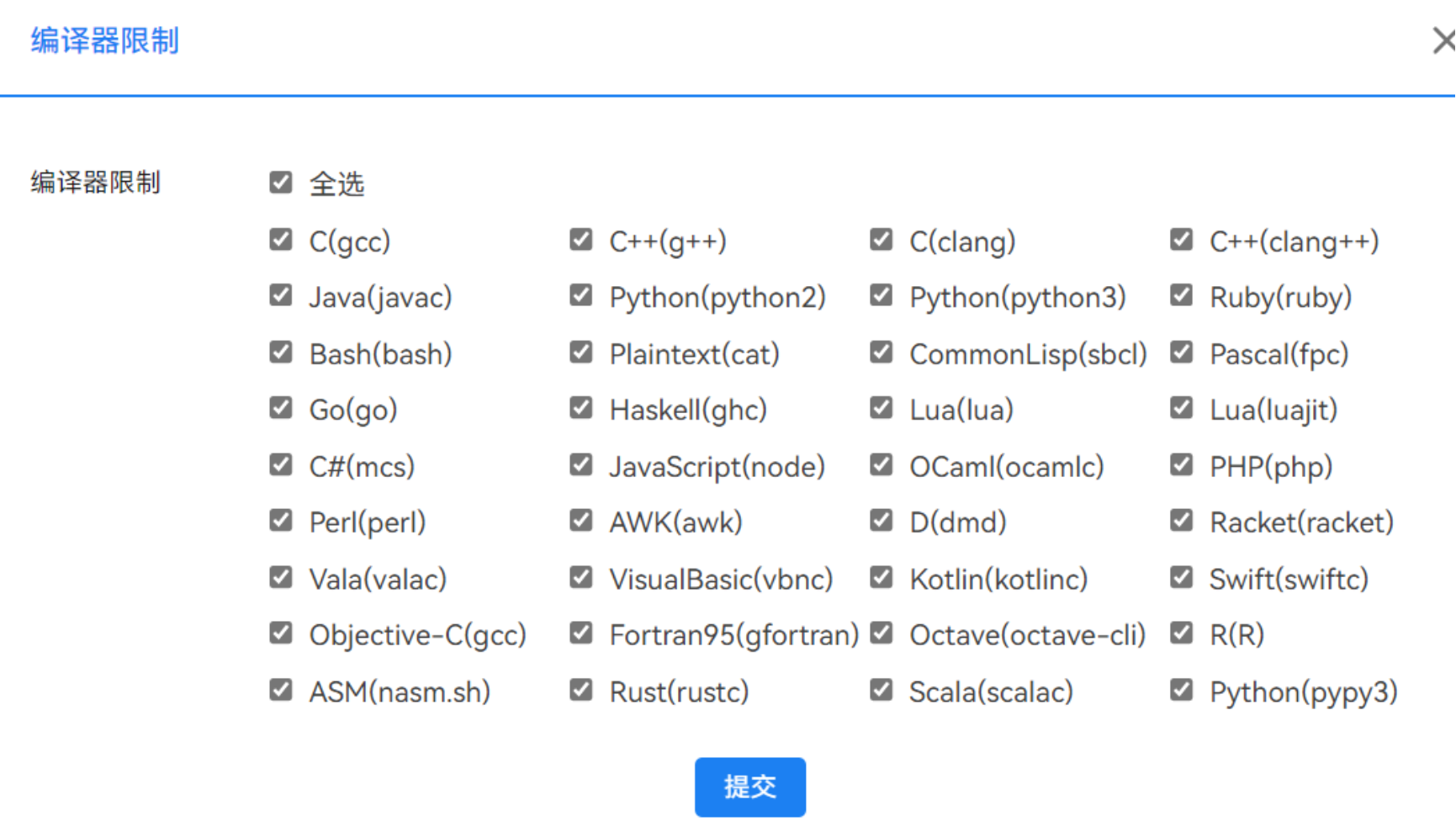 ① 可不限制语言,目前平台提供36种语言,默认C(gcc)语言,可在编程答题框内自己选择;