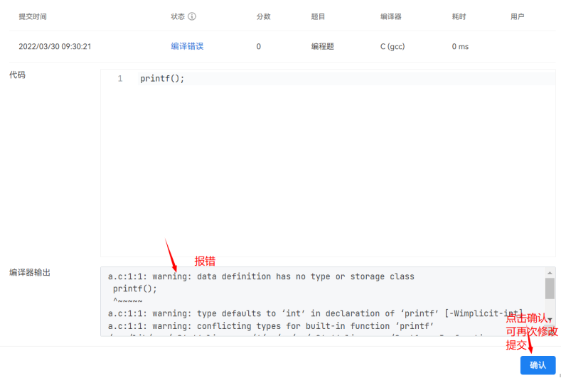 ② 编程过程可以多次提交该题,提交后如果有错误,平台会提示一定的报错,点击确认可再次回到答题框内修改提交,只要不提前结束考试,是可以允许多次提交该编程题目;