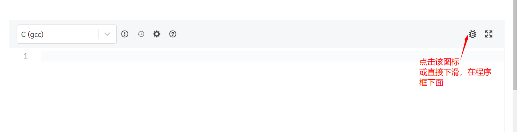 ① 可以使用平台提供的测试区,在程序答题框下面,两种方式打开,第一种,点击答题框右上角按钮,如下图所示。第二种方式:直接下拉页面,就在程序答题框下面,展开测试区即可;