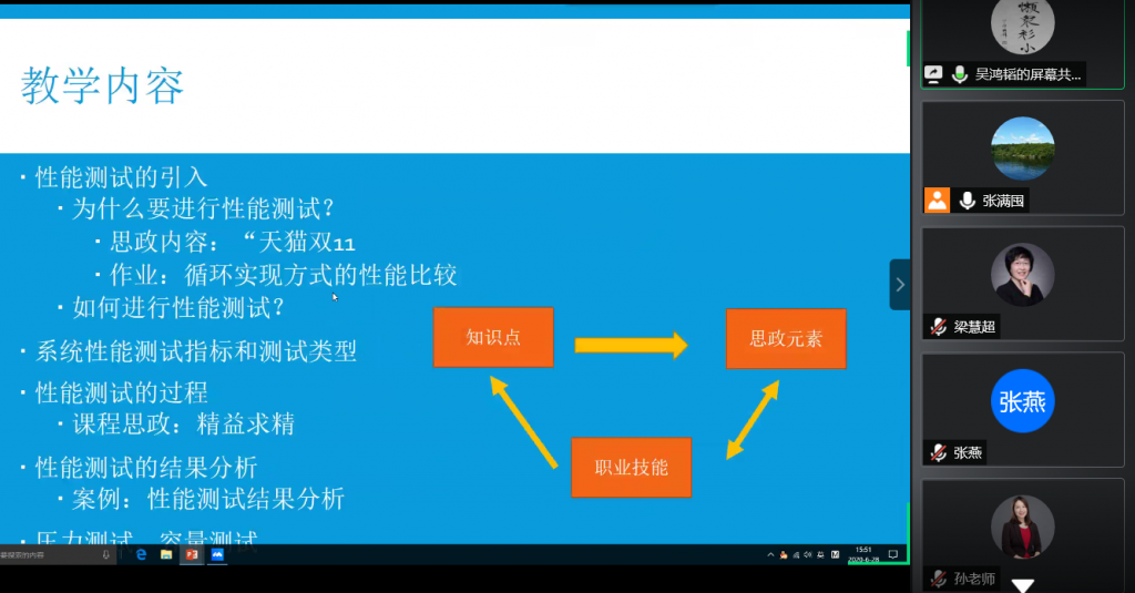 吴鸿韬老师带来的是《软件测试技术》的课程案例讲解,由阿里巴巴“双11”的交易峰值的技术进步,引出第一个问题:如何设计并实现满足这样性能要求的网站?给出了一些和获取交易峰值所需要的相关技术。通过实际应用案例中嵌入的先进技术的简介,开阔员工的视野,激发员工的学习兴趣,有助于课堂教学与职业技能培养的衔接。由阿里巴巴“双11”交易峰值的技术进步,引出的第二个问题是“如何测试所实现的网站是否满足相关的性能指标?”通过这第二个问题,回到课程教学内容“性能测试”、“性能测试工具”上。