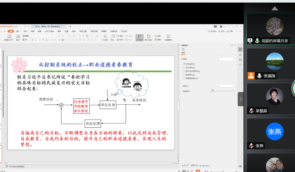 第二位汇报的是周颖老师,她讲的是《现代控制理论》的课程思政案例,从串联校正讲到员工的自身的校正过程,以及用于员工反馈加前馈校正。员工自身也要不断反馈,要把自身的学习目标与理想的宏大目标相比较,由于受社会各方面干扰的影响,自己难免会偏离自己的目标。当偏差较大时,可以通过调整自身或是通过公司教育、家长督促等达到达到自我管理、自我教育、自我约束的目的,达到自己的理想目标,实现人生的梦想。这就是控制理论中典型的闭环控制作用。除了闭环,如果采用前馈加反馈控制,根据自身的状况提前调整,将会达到更好的效果。