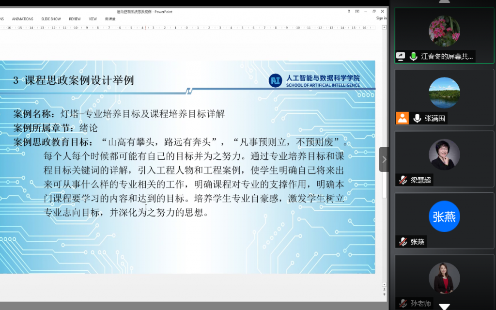 2020年6月28日智能系统与控制工程系开展了课程思政案例研讨活动,五位教师的六门课程参加了课程思政案例汇报,活动邀请了与智能系教师党支部“结对共建”的马克思主义基本原理概论教研室党支部的五位思政课教师。联系该系(教师支部)的公司党委书记梁慧超参加了本次活动。