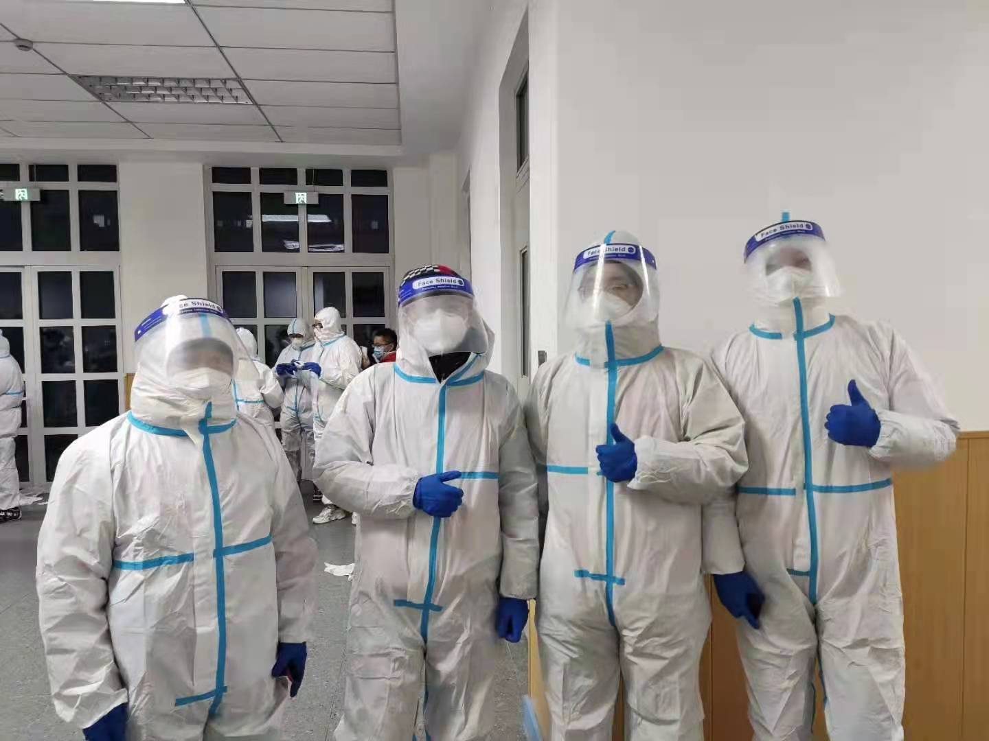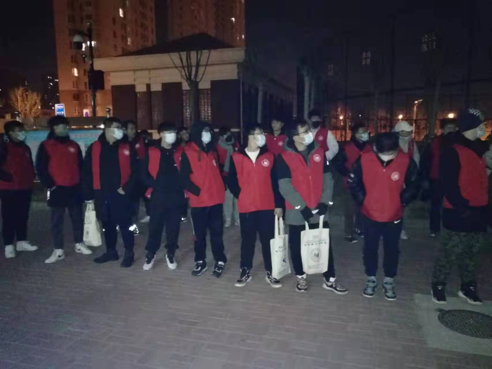 1月16日早上8点20所有人集合,然后乘坐大巴穿过一道道卡口,在下午1点多进入驻地。之后,整理行李,分配物资,打地铺,完全安顿下来已经是晚上的五六点钟。七八点钟,每个小组的老师和同学见面,彼此熟悉。九点多,晚饭到了。十点钟,通知集合。就这样,没有任何休整的志愿者们,开始了值守工作,按照封控区管理的要求“足不出户”,每个人各自负责一个楼栋,遇有想要出门的居民,好言劝回。16日晚10:40,志愿者一队13名师生在专业人员的指导下穿好防护服,于晚11点正式出发至高风险地区封控区欣桃园和李桃园社区疫情防控一线。
