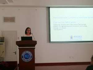 Catherine McCartin博士结合自己的研究领域和教学经验作了题为《Parameterized complexity and how to use it》的报告,详细讲解了参数复杂度是什么,如何应用和如何扩展,并且介绍一个算法设计“工具箱”,向与会师生分享了自己团队最新研究进展。虽说全程是英文讲座,但是整场讲座大家认真聆听思考,Catherine McCartin博士真诚优雅的讲课方式赢得了在场师生的阵阵掌声。讲座之后,与会师生就感兴趣的问题与Catherine McCartin博士进行了讨论和交流。