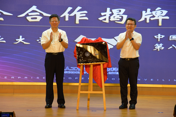段国林与华宇(大连)信息服务有限公司总经理闫立夏为“校企合作研发中心”揭牌